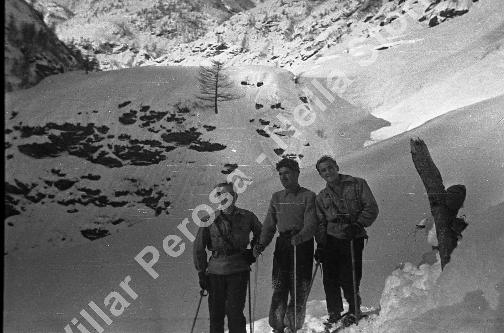 Gruppo di partigiani che sta salendo verso il colle della Valletta da Rodoretto. A destra Ferruccio Cinquetti, al centro Alberto Marcellin e a sinistra Mario Cinquetti.