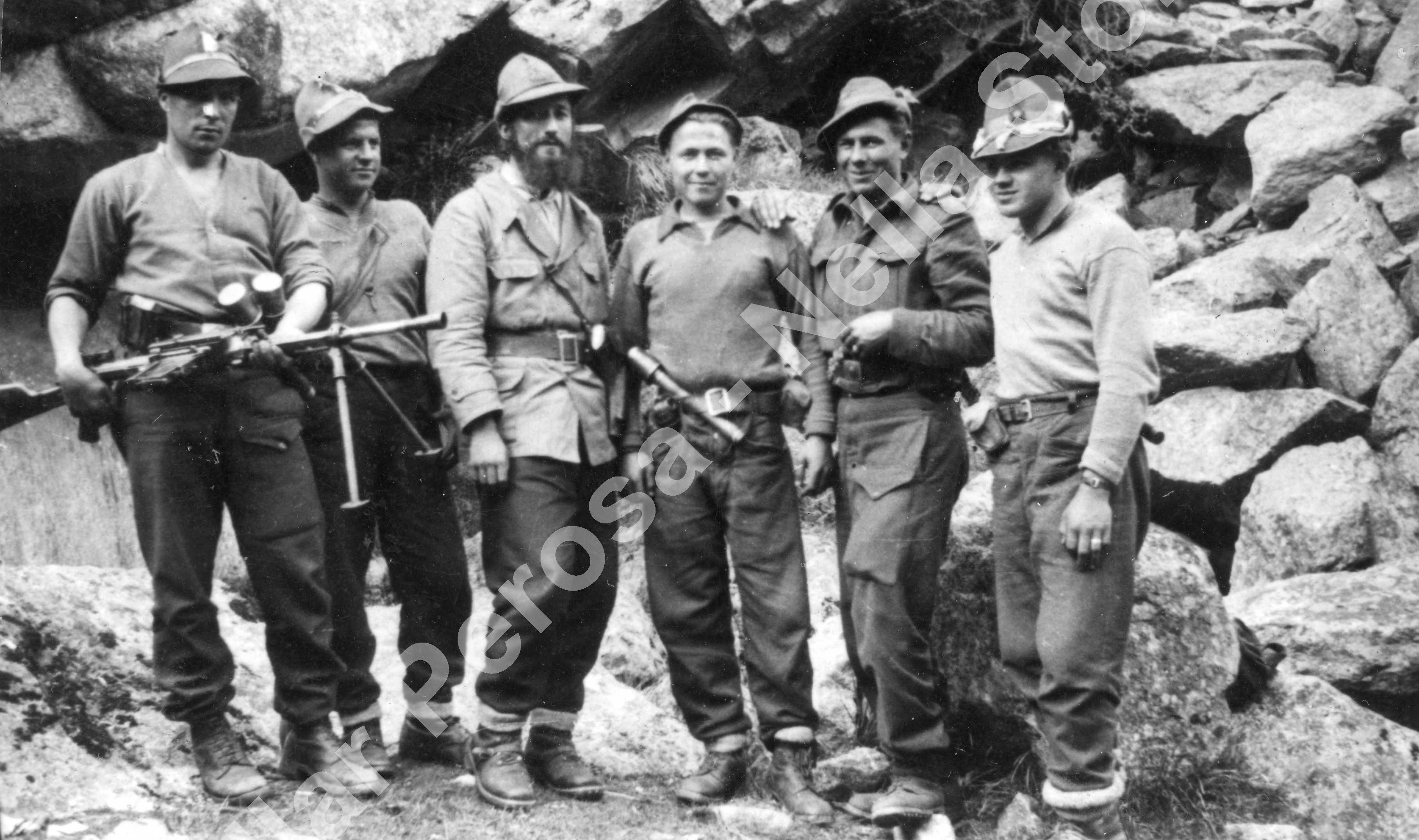 Gruppo di partigiani della banda di Fiore Toje (il terzo da sinistra). Con lui vi sono anche dei prigionieri russi passati a combattere nella Resistenza.