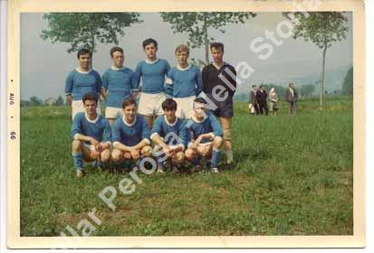 La squadra di calcio del Pinasca. In piedi da sinistra: F. Giustetto, E. Prot, U. Momigliano, P. Bianciotto, R.Damiano. Accosiati da sinistra: R. Rostagno, ? Sola, B. Richiardone, E. Paolasso.