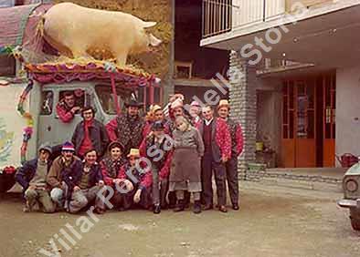 Anni '70. Carro costruito per il carnevale di Pinasca. L'autocarro che faceva da supporto era quello di Bernardino Richiardone e la foto è stata scattata nel suo cortile. La donna presente nella foto è Maria Godino, madre di Bernardino.