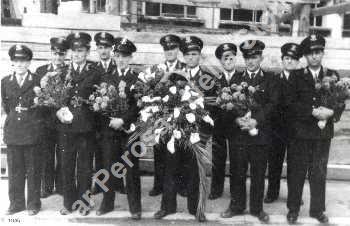 Nei pressi della rotonda RIV omaggio ai caduti, il corpo dei Vigili del Fuoco aziendali rende omaggio ai caduti; da sinistra con i fiori Enzo Micca, Emilio Bourcet, Ernesto Damiano, Richiardone, Ferri; senza fiori da sinistra Capra, Heritier, Buseto, Morello, Truffa, Maccogno