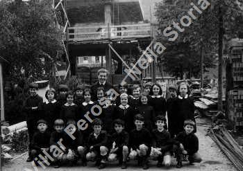 La maestra Ester Bourlot con la sua classe, anno scolastico 1971/72 e sullo sfondo la parte nuova di scuola in costruzione, l'attuale mensa.