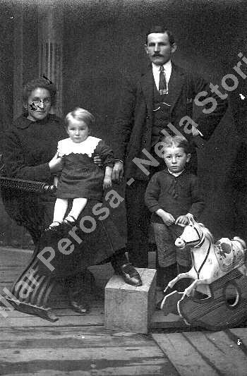 Comba Beniamino e Grangetto Giuseppina con i figli. Foto scattata nella prima metà del '900 nello studio fotografico dove c'era il cavallo a dondolo.
