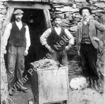 Imbocco della miniera di grafite "Gran Roccia" alla borgata Don, nel 1910. In primo piano un carrello per l'esrazione del materiale. La miniera, aperta nel 1892 a cura della Soc. E. Brayda & C., raggiunse i 750 metri di galleria. Rimase in funzione fino al 1940. Il materiale era trasportato in slitta o con carri a cavalli fino alla casa Saret e di lì al Mulino di S Germano di proprietà di Davide Vinçon.
