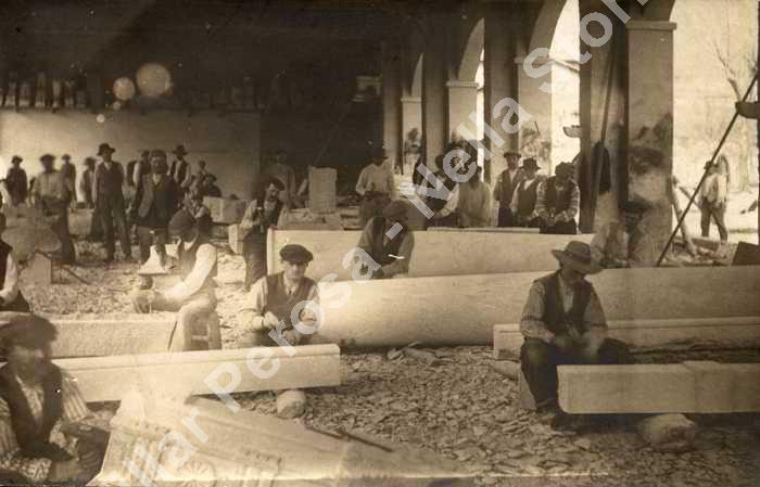 Proprietari della cava Aurelio e Felice Stella. Si sta lavorando alle colonne della chiesa del Sestriere. Tra i soggetti fotografati vi è Luca Baretta.