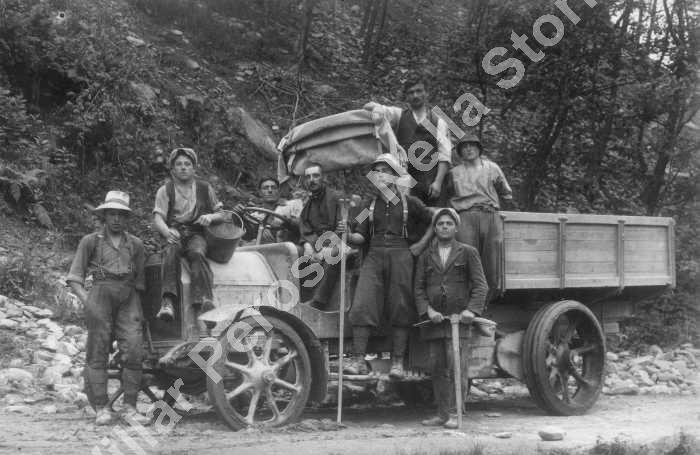 Operai addetti alla costruzione del canale idroelettrico che alimenterà la centrale RIV situata in borgata Grange. La foto è stata scattata vicino al bacino di alimentazione del canale. L'uomo seduto accanto all'autista è il sig. Mourglia Umberto. Il progetto è del 1919.