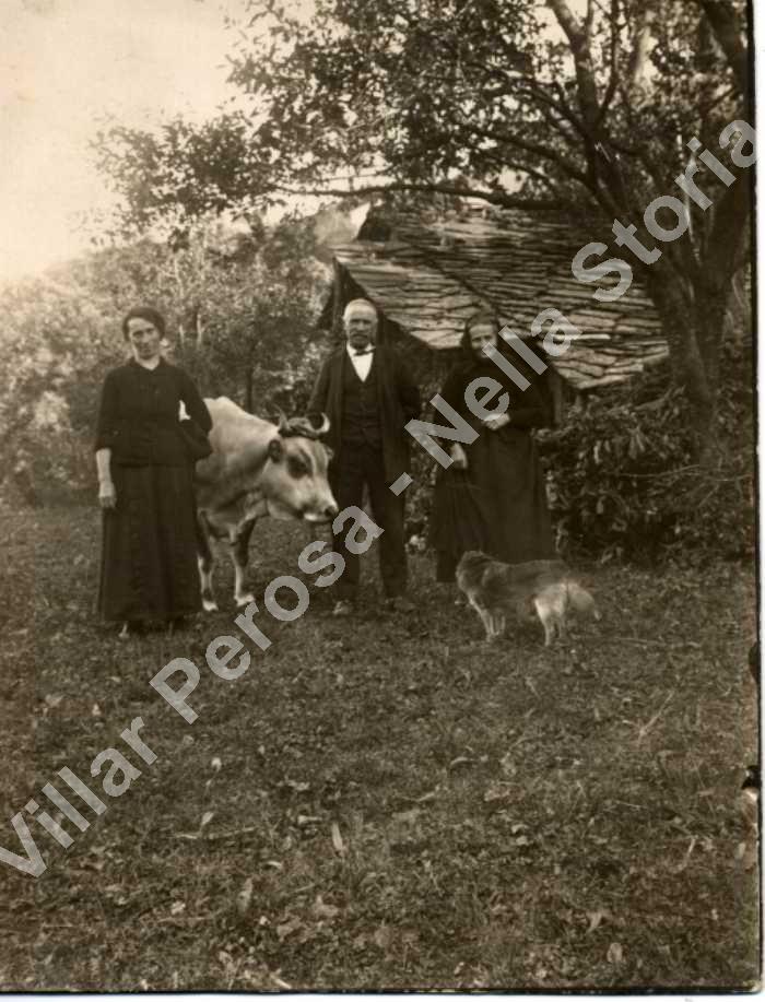 Anni '30. Da sinistra: Elisa Balma, il padre Antoine Balma, la madre M. Magdeleine Micol. Particolare curioso sono ritratti in compagnia degli animali domestici: la mucca e il cane.