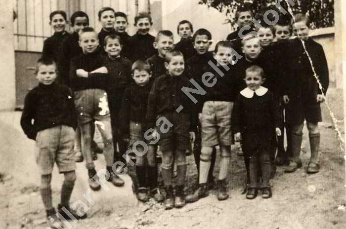 Anni '40. Gruppo di ragazzi dell'orfanotrofio di Pomaretto. Quando è arrrivato Enrico gli è stato assegnato il n° 13. Enrico è il 4° della prima fila da sinistra. L'orfanotrofio di Pomaretto era solo maschile, mentre quello di Torre Pellice era anche femminile.
