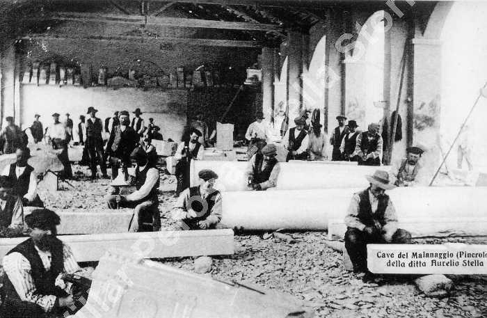Anni '30. Scalpellini al lavoro per le colonne della chiesa del Sestriere.