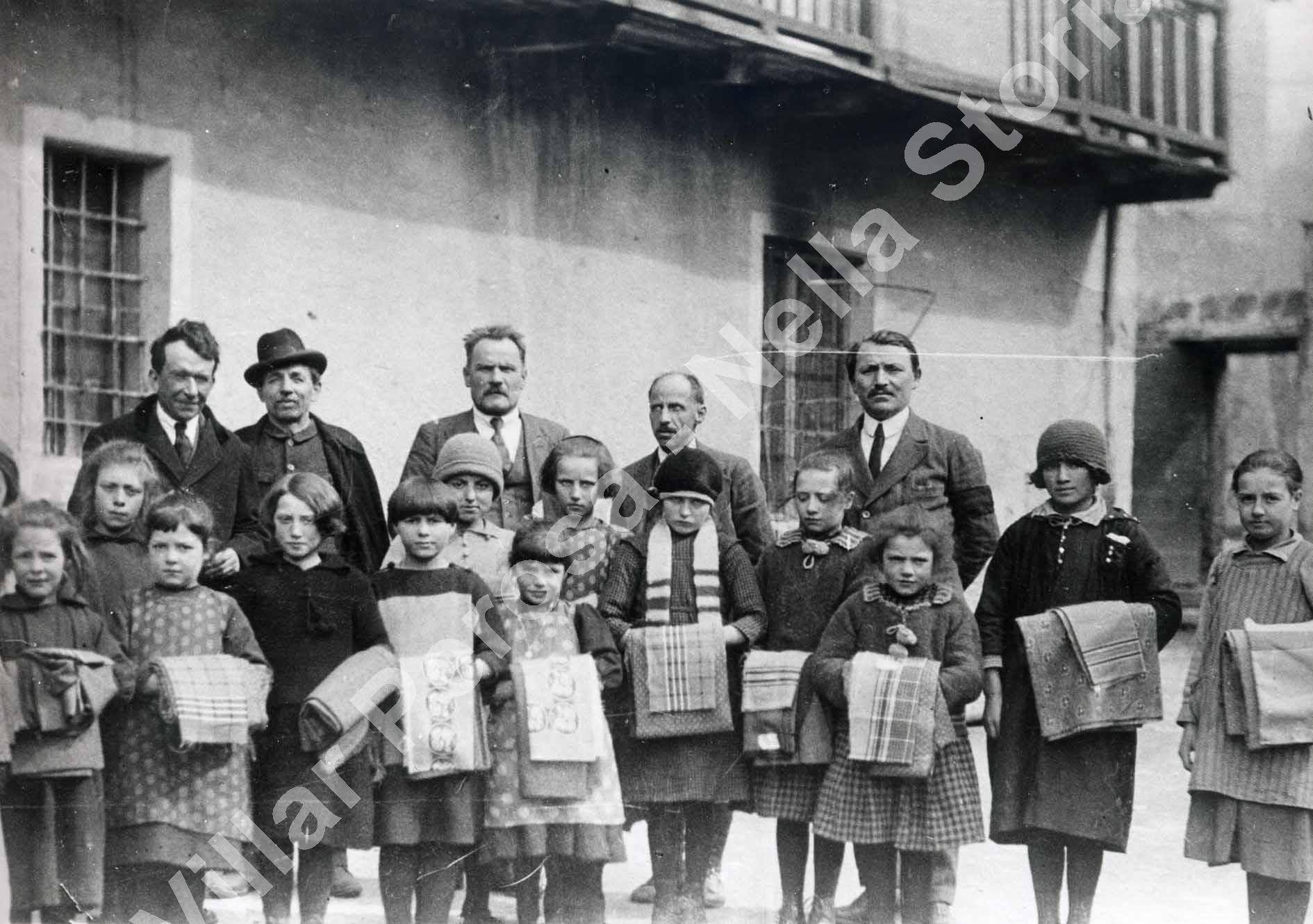 L'anno è approssimativo. Le bambine sono fotografate davanti alle scuole (l'edificio dell'ex - seminario). Si apprestano alla lezione di cucito. Il quarto personaggio da sinistra è il segretario comunale.