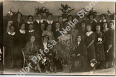 Partecipanti al corso di taglio e cucito organizzato nei locali del convitto Abegg. L'insegnante era Elvira Frizet (con il cappello nella foto), originaria di Perosa A. ma residente a Torino. I migliori capi realizzati furono esposti al Palazzo Lascaris di Torino. Le ragazze con il grembiule e il colletto bianco sono convittrici. Accanto alla sig. ra Frizet c'è la direttrice del convitto, suor Rosetta Gastaldi.