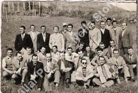 Gruppo di coscritti della classe 1925. Il secondo in piedi da destra è Anselmo Giustetto padre del proprietario della foto. Il suonatore di fisarmonica è Angelo Prot.