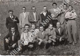 Coscritti della calsse 1925 in festa. Il suonatore di fisarmonica è Sergio Galliano. Il personaggio col bicchiere in mano è Anselmo Giustetto.