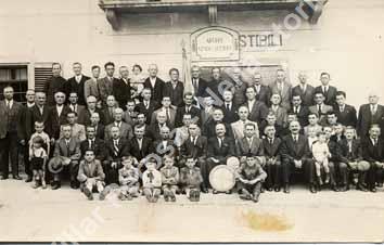 Gruppo di uomini dell'Azione Cattolica fotografati davanti al negozio di generi alimentari in via Cavour, 11.