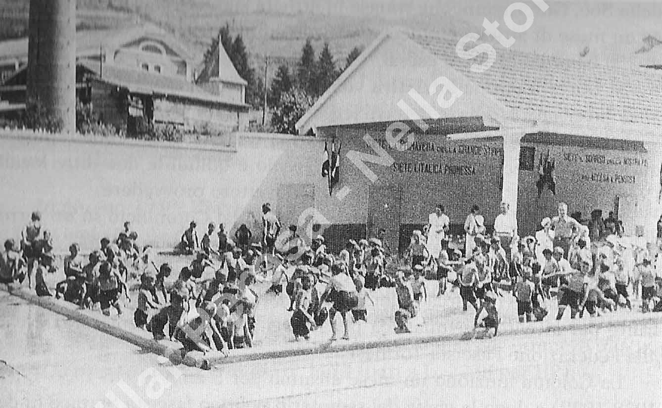 Si tratta della colonia elioterapica del Cotonificio Abegg. La foto è stata scattata intorno agli Anni '20 - '30. E' pubblicata in R. Lussana, Storia della Manifattura di Perosa Argentina, Alzani Editore, Pinerolo (To), 1993