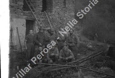 Autunno 1944. Rio Agrevo, sopra Perosa Argentina. Al centro, con la barba e la sigaretta, il comandante partigiano Baldin (Enrico Poet), già alpino di Ettore Serafino durante la guerra nei Balcani.