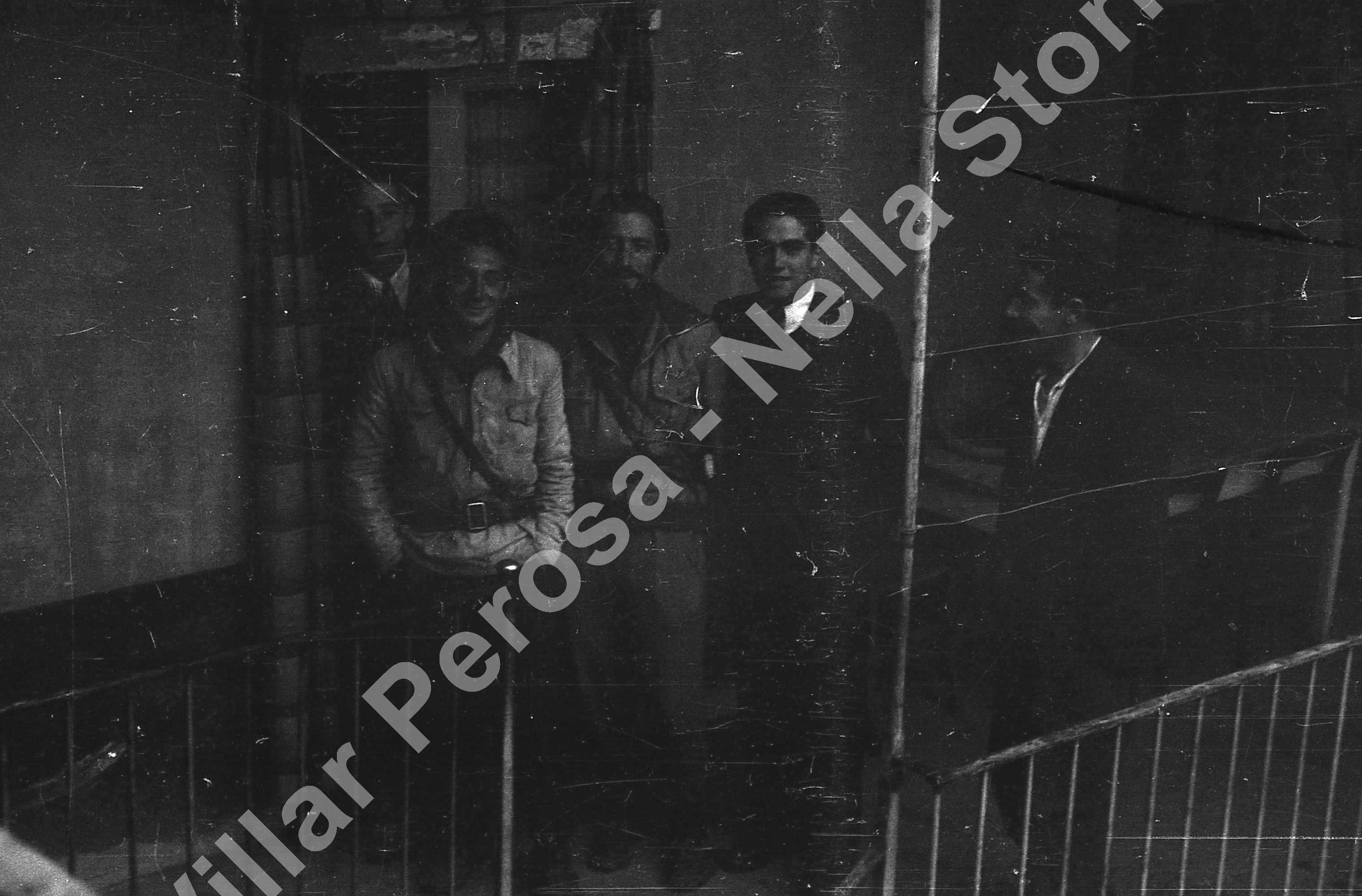 Autunno 1944. Freccia (Inverso Pinasca, Trattoria dei Fiori). Da sinistra: il primo dietro Marcello Long. Lorenzo Tavazzi (giacca bianca detto il "Moru"), Fiore Toje, Umberto Murglia, ?.