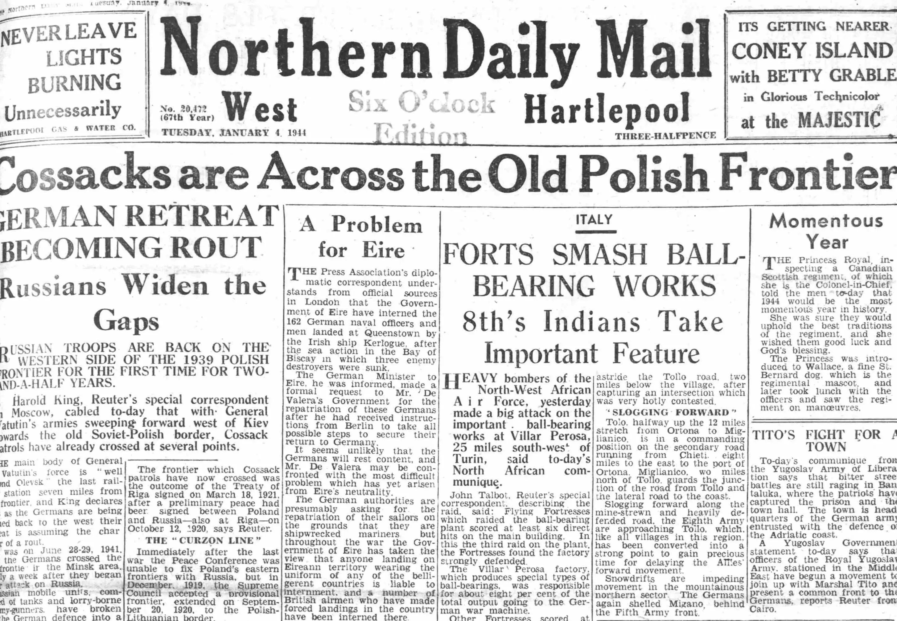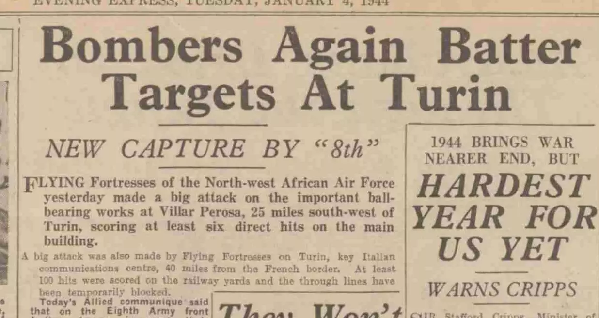Anche la stampa inglese fornisce una ampia copertura dell’evento: particolarmente interessanti sono le pagine dello Shields Daily News del 4 gennaio che titola in prima pagina “Forts hit vital italian works” o del Liverpool Evening Express che titola “Bombers again Batter Targets at Turin” e nel sottotitolo riporta come le fortezze volanti abbiano compiuto un grandioso attacco mettendo a segno ben 6 colpi diretti sull’edificio principale della fabbrica di Villa Perosa.