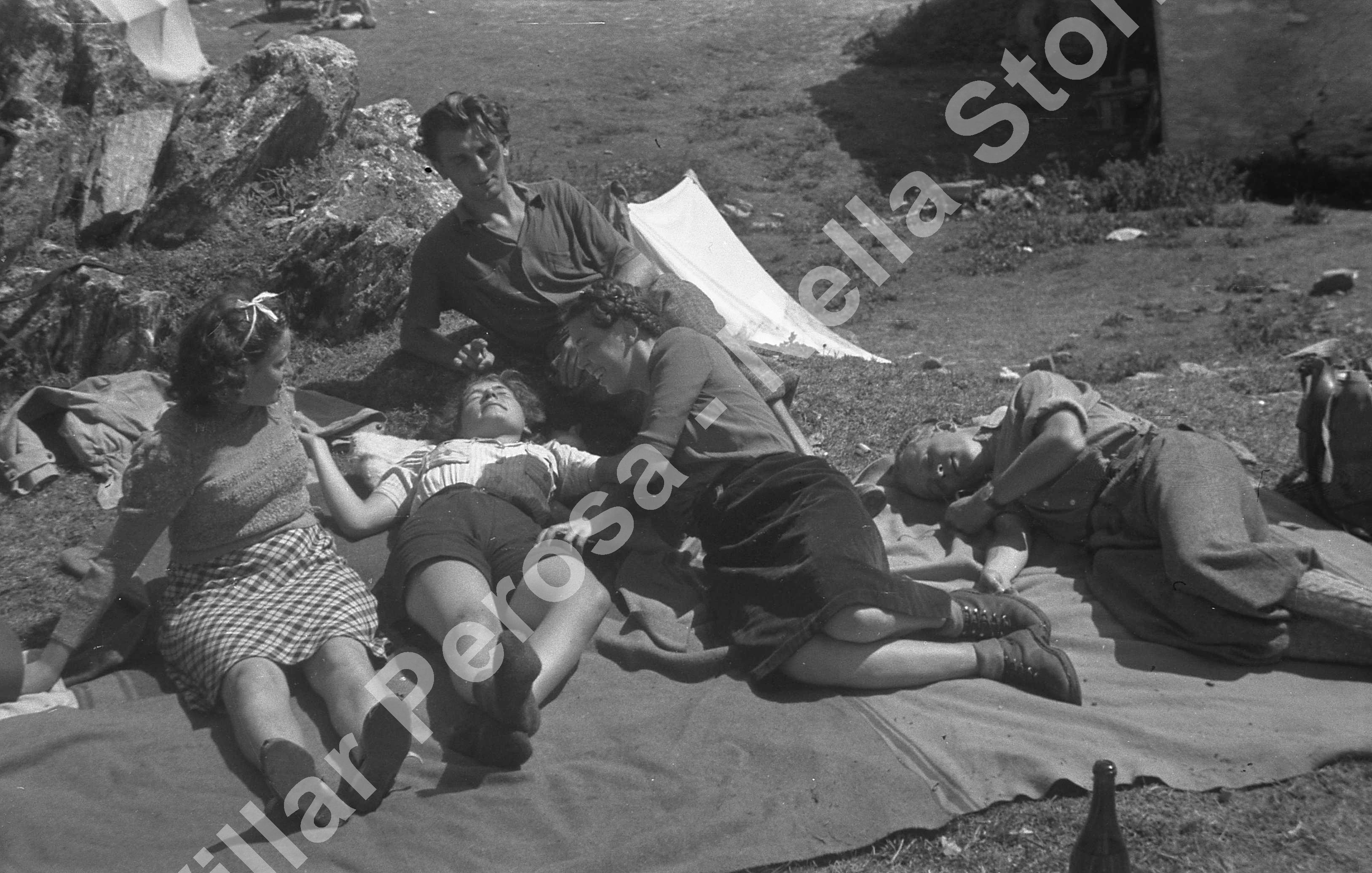 A fine guerra, in val Troncea, un gruppo di staffette. Si riconoscono Viola Lageard (coricata) e Marcella Gay con la treccia.