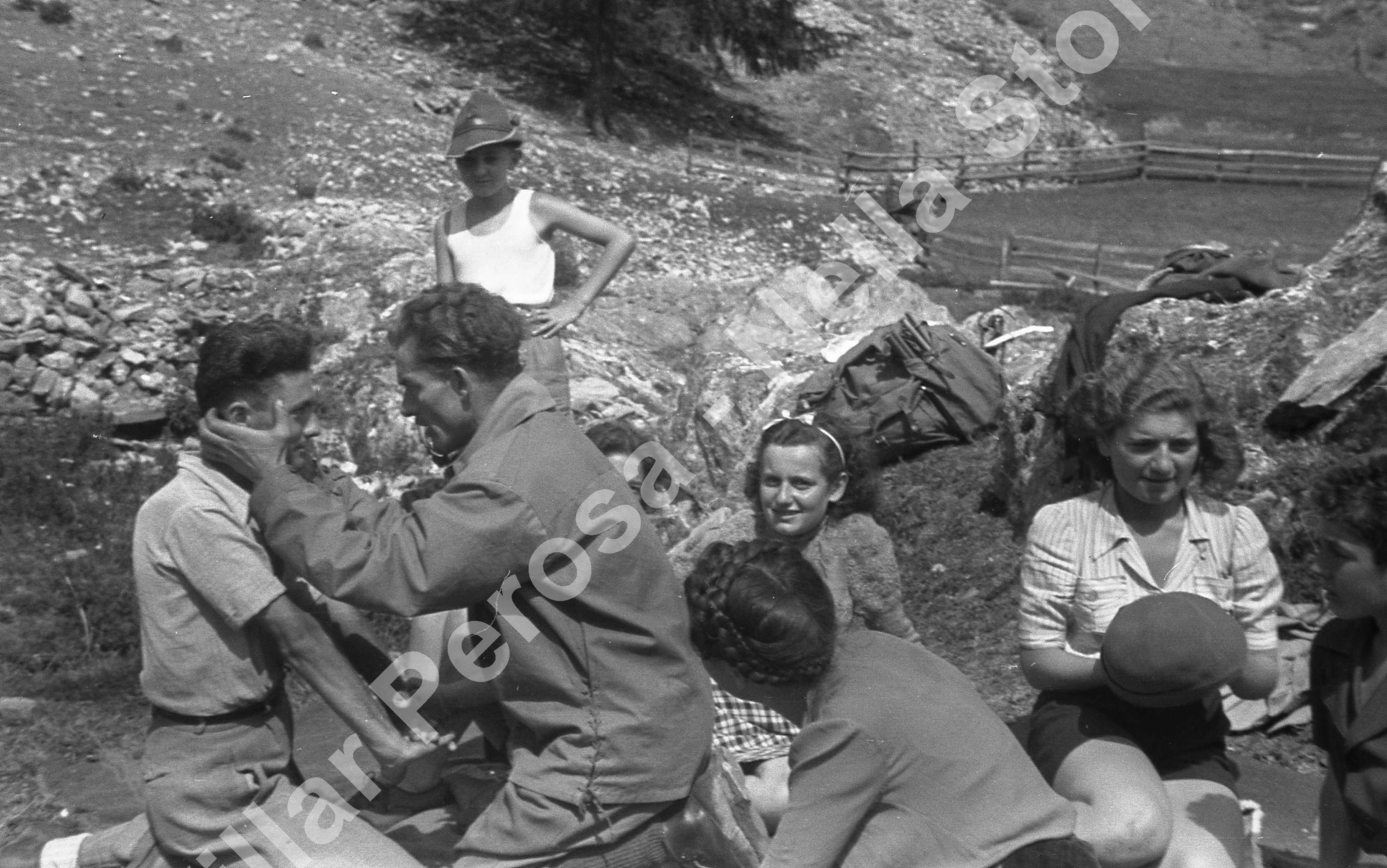 A fine guerra un gruppo di partigiani e staffette. Enrico Marcellin, fratello di Alberto, nell'atto di ipnotizzare un compagno. Di schiena con la treccia Marcella Gay e con la camicetta bianca Viola Lageard.