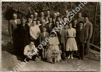 Prima Comunione di Carla Prot, fotografata con il gruppo dei parenti sulla strada di fronte alla propria abitazione in borgata Gialetto.