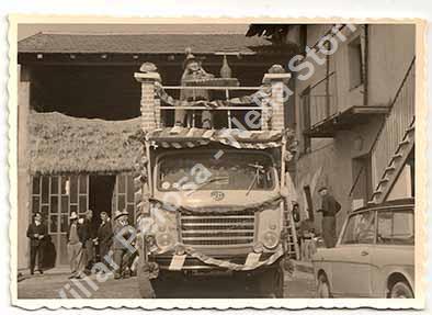 Anni '60. Uno dei primi carri che sono stati costruiti per il carnevale di Pinasca. L'autocarro che faceva da supporto era quello di Bernardino Richiardone e la foto è stata scattata nel suo cortile.