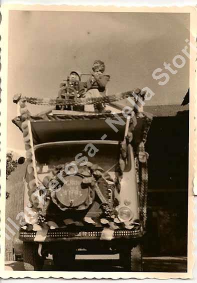 Uno dei primi carri che sono stati costruiti per il carnevale di Pinasca, visto dal basso. L'autocarro che faceva da supporto era quello di Bernardino Richiardone e la foto è stata scattata nel suo cortile.