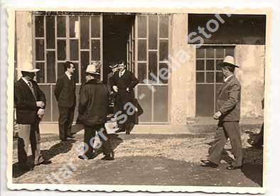 Gruppo di ideatori dei primi carri allegorici costruiti per il carnevale di Pinasca, L'autorimessa sullo sfondo è di Bernardino Richiardone e la foto è stata scattata nel suo cortile.