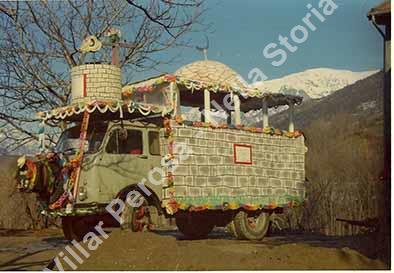 Anni '70. Carro che rappresenta i pozzi di petrolio. Realizzato per il carnevale di Pinasca. L'autocarro che faceva da supporto era quello di Bernardino Richiardone e la foto è stata scattata nel suo cortile. Era l'anno dell'austerity, mancava il petrolio e la domenica si andava a piedi.