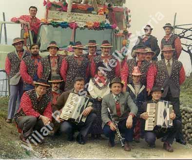 Anni '70. I protagonisti di un carnevale. Il primo accosciato da sinistra è Marco Bleynat, il musicista con il clarinetto è Vittorio Gouthier, mentre l'ultimo fisarmonicista è Albino Raviol. L'autocarro che faceva da supporto era quello di Bernardino Richiardone e la foto è stata scattata nel suo cortile.