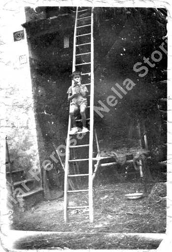 Ribetto Aldo fotografato nel cortile della casa in Via A. Bianciotto n° 35, la scala è appoggiata al fienile che oggi è diventato un alloggio.