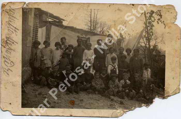Festa della scuola, recita sul tricolore. Sullo sfondo c'è il muro del cimitero. La bambina vestita di bianco al centro è Malvina Ughetto.