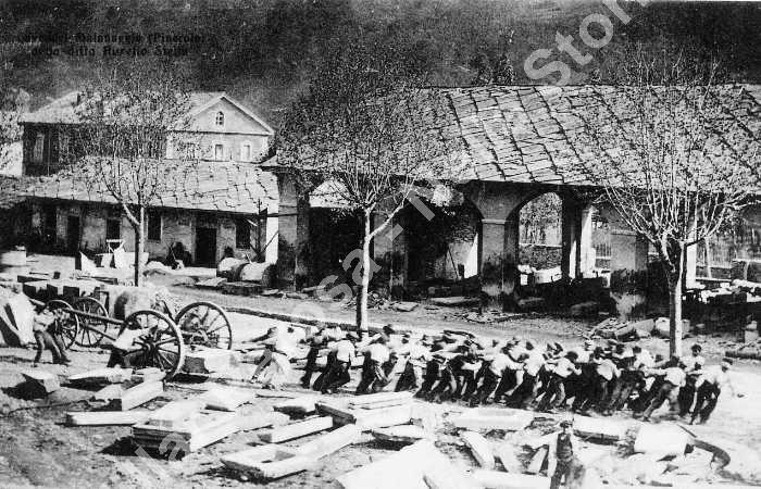 Operai trascinano un masso aiutandosi con una macchina denominata "tincabale".