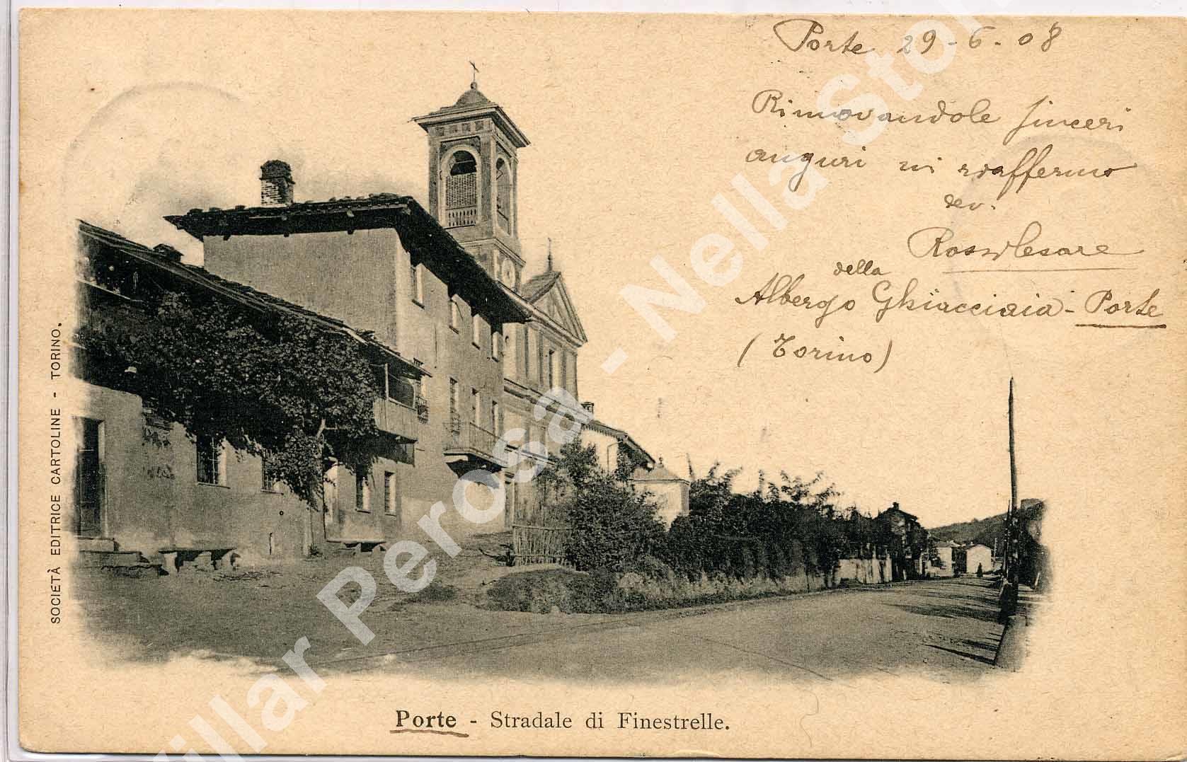 L'anno è approssimativo. Compare la via Nazionale e la chiesa parrocchiale con l'edificio dell'albergo. Si tratta di una cartolina postale.