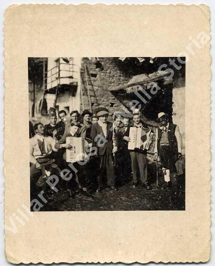 Forse 1953. Carnevale di Gialetto. Cortile detto dei "Giouanin". I musicisti da sinistra sono: Guido Prot (fisarmonica), Sergio Galliano (fisrmonica), Giuseppe Franzoso (clarinetto).