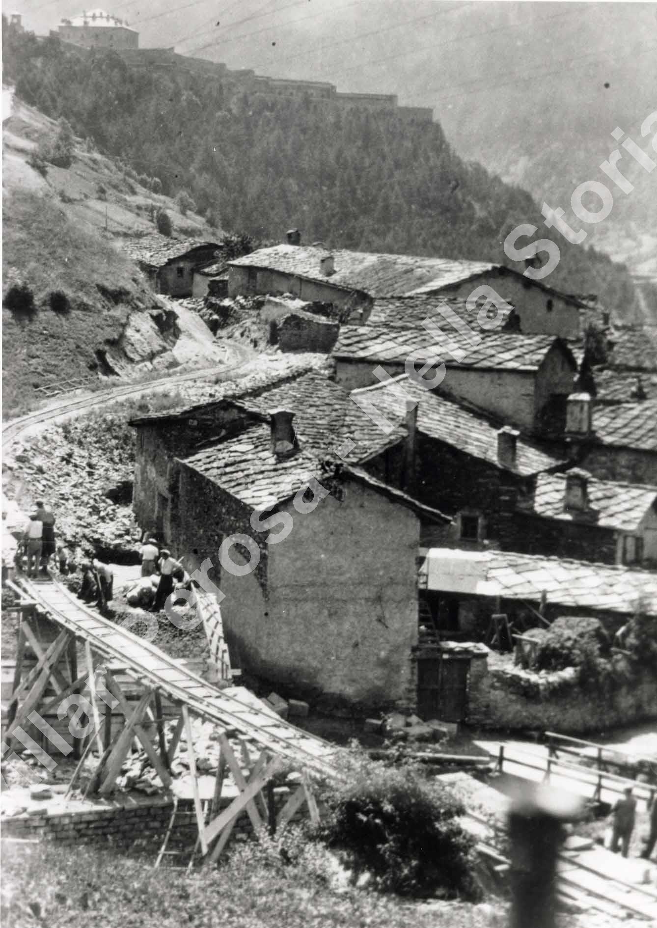 L'anno della foto è approssimativo. Si tratta della costruzione della strada che aggira il centro abitato di Fenestrelle. Sullo sfondo si intravede il Forte.