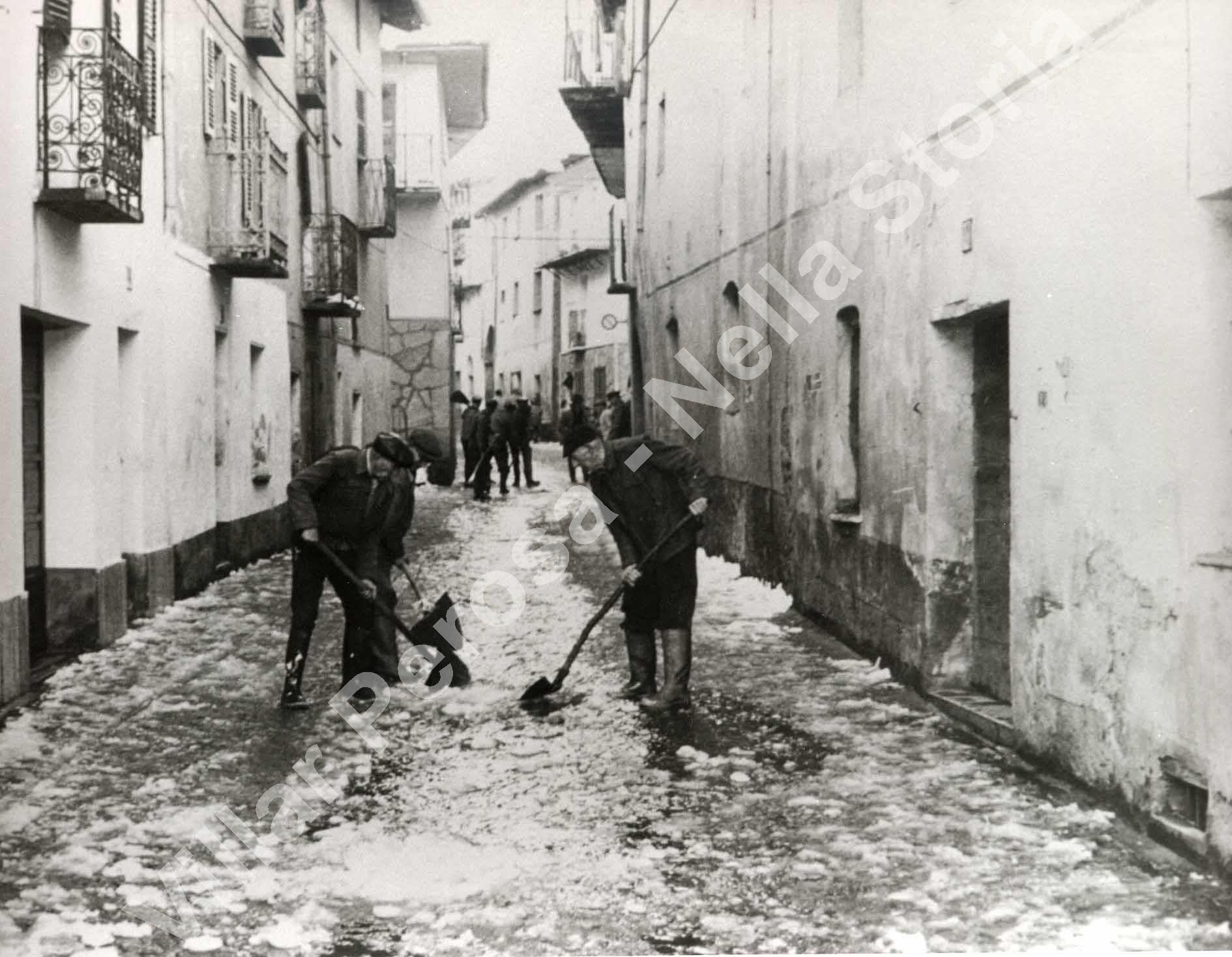 L'anno della foto è approssimativo. Gli uomini stanno spaccando il ghiaccio che si è formato sulla strada.