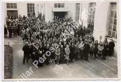 Gruppo di dipendenti con i loro faliliari davanti allo stabilimento Widemann.