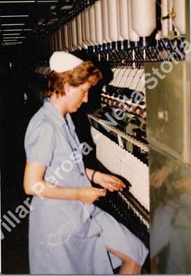 L'operaia ritratta è Ghigo Alda. Si trova nel reparto "Rings" dell'allora "Manifattura di Legnano" di Perosa Argentina (ora New Co. Cot). Sta collegando il filo delle spole alle bobine.