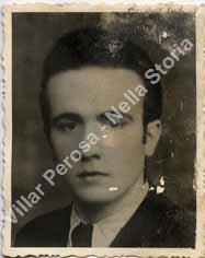 Militare di stanza nella caserma di via Cavour a Perosa Argentina dal 1940 al 1945. La cucina da campo era nel cortile della "Locanda del Maniscalco", di proprietà della famiglia Merlo, con la quale alcuni giovani mantennero i contatti anche a guerra conclusa. Alle ore dei pasti veniva suonata la tromba e ognuno prelevava la sua razione con la gavetta. La data precisa scritta sul retro è 29 luglio 1945. Il testo: "Lui dal cielo le sorride e prega per un suo dolce avvenire". La firma è illeggibile.