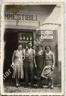 La famiglia di Merlo Terenzio di fronta al negozio di generi alimentari di via Cavour, 11. Da sinistra merlo Paolina, Castagno Maddalena, Merlo Terenzio, Merlo Maria.