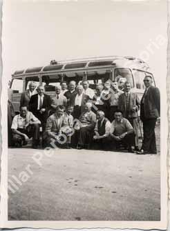 Gita di amici, forse con uno dei primi pullman della ditta "Tessore". Anni '50.