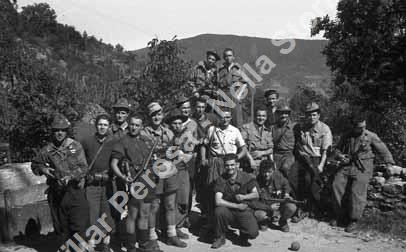 Autunno 1944 - Banda guastatori di Gianni Daghero (Lupo) ai Ciomp di Cumiana. Da destra 2° Giorgio Catti, 3° Gianni Daghero, 4° Ferruccio Cinquetti, dietro Cinquetti e Daghero Erminio Pons, 5° Eraldo Vecco, 6°forse Dolci, 7° Attilio Vecco, 8° Aldo Pons col berretto grande, 9°Mario Cinquetti col berretto storto,10° Camillo Capra, 12° forse Ruggero Bianciotto; in alto sul muretto col berretto Franco Vola, accanto Gino "otite", in basso col mitra fratelli Prina,