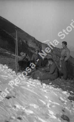Forse si tratta dei primi mesi del 1945. Gran Dubbione - Pinasca. Gruppo di partigiani. Con la pipa Ettore Serafino e a destra Angelo Squeri.
